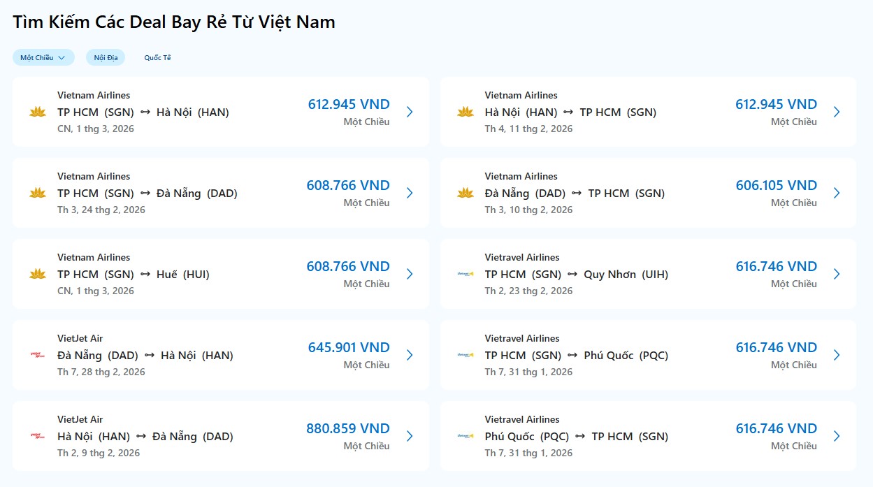 Đặc biệt, nếu bạn đang có nhu cầu tìm vé máy bay Hà Nội vào Sài Gòn giá rẻ, Traveloka là lựa chọn lý tưởng nhờ hệ thống cập nhật giá vé theo thời gian thực, hiển thị rõ ràng giá đã bao gồm thuế phí, hạn chế tối đa chi phí phát sinh.